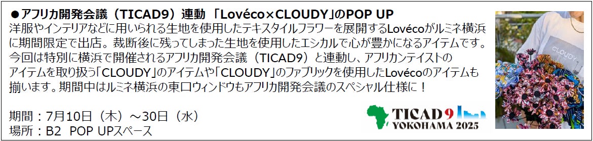 ルミネ横浜では、アフリカ開発会議(TICAD9)と連動した「Lovéco ×CLOUDY」のPOP UPや、各ショップのエシカルな取り組みを紹介するキャンペーンを展開します。さらに、レストラン・カフェではキャンドルを灯すライトダウンイベントなど、館内全体でエシカルなライフスタイルを体感できる企画を実施します。