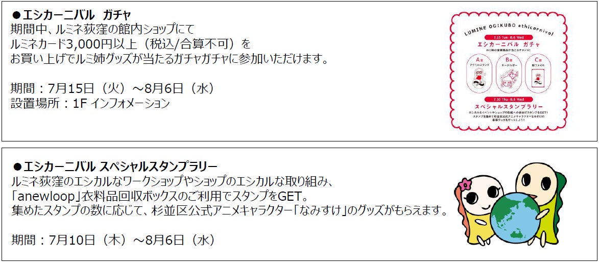 ルミネ荻窪では、約50ショップがエシカルな取り組みを実施します。ルミ姉のグッズが当たる「エシカーニバル ガチャ」の設置やなみすけグッズがもらえるスタンプラリー、魅力的な地域のお店が集まる「よりみちマルシェ エシカーニバル特別編」、杉並区と連携したワークショップの開催、お客さま参加型展示など盛りだくさんです。