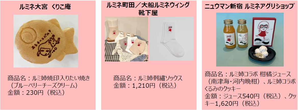 各ショップでは、人気キャラクター「ルミ姉」とコラボした特別な商品をキャンペーン限定で販売いたします。ルミネ大宮のくりこ庵ではルミ姉の焼き印が入った「ルミ姉焼印入りたい焼き(ブルーベリーチーズクリーム)」を販売するほか、ルミネ町田と大船ルミネウイングの靴下屋ではルミ姉オリジナルソックスをご用意。ニュウマン新宿のルミネアグリショップではルミ姉のイラストが描かれたラベルの柑橘ジュースやクッキーを販売するなど、ここでしか買えない「ルミ姉グッズ」が盛りだくさんです。