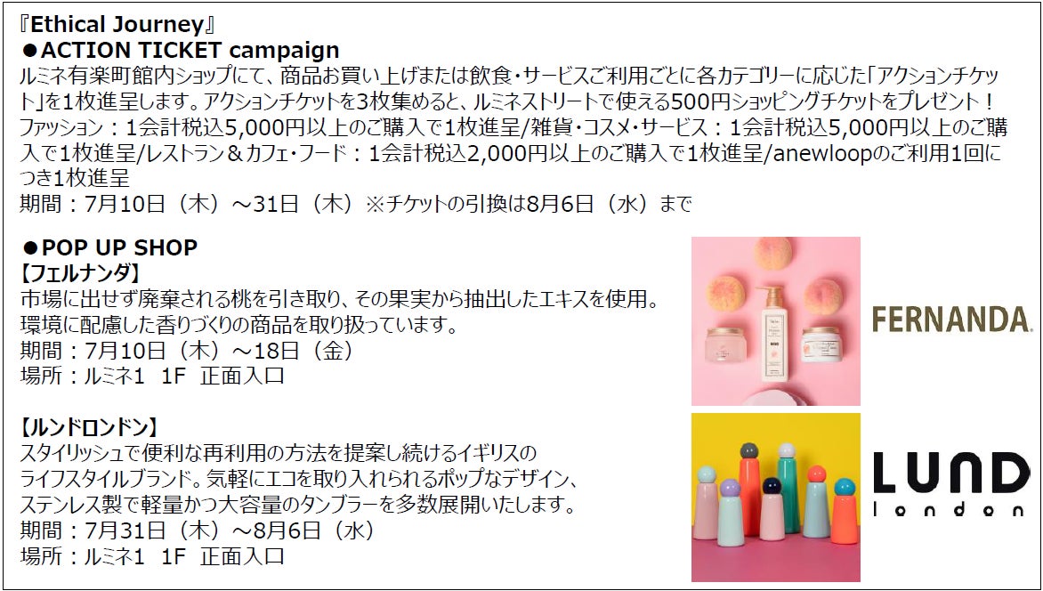 ルミネ有楽町では、身近にあるエシカルな考えや、各ショップの取り組みをご紹介しています。エシカルブランドによるPOP UPの実施や、買い回りでショッピングチケットがもらえるアクションチケットキャンペーンを館内で同時開催!