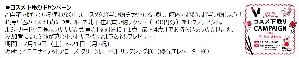 今回、「ルミネ新宿」「ルミネ北千住」「ルミネ立川」「ルミネ町田」「ルミネ川越」「ルミネ藤沢」「大船ルミネウィング」の7店舗でコスメ下取りキャンペーンを実施いたします。