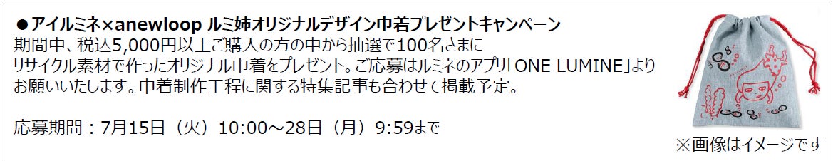 アイルミネでは、ルミネの資源循環サービス「anewloop」と協業したオリジナルデザイン巾着のプレゼントキャンペーンや、各ショップのエシカル商品を集約し、環境に配慮したアイテムを一覧で見て購入することができるコンテンツを展開します。