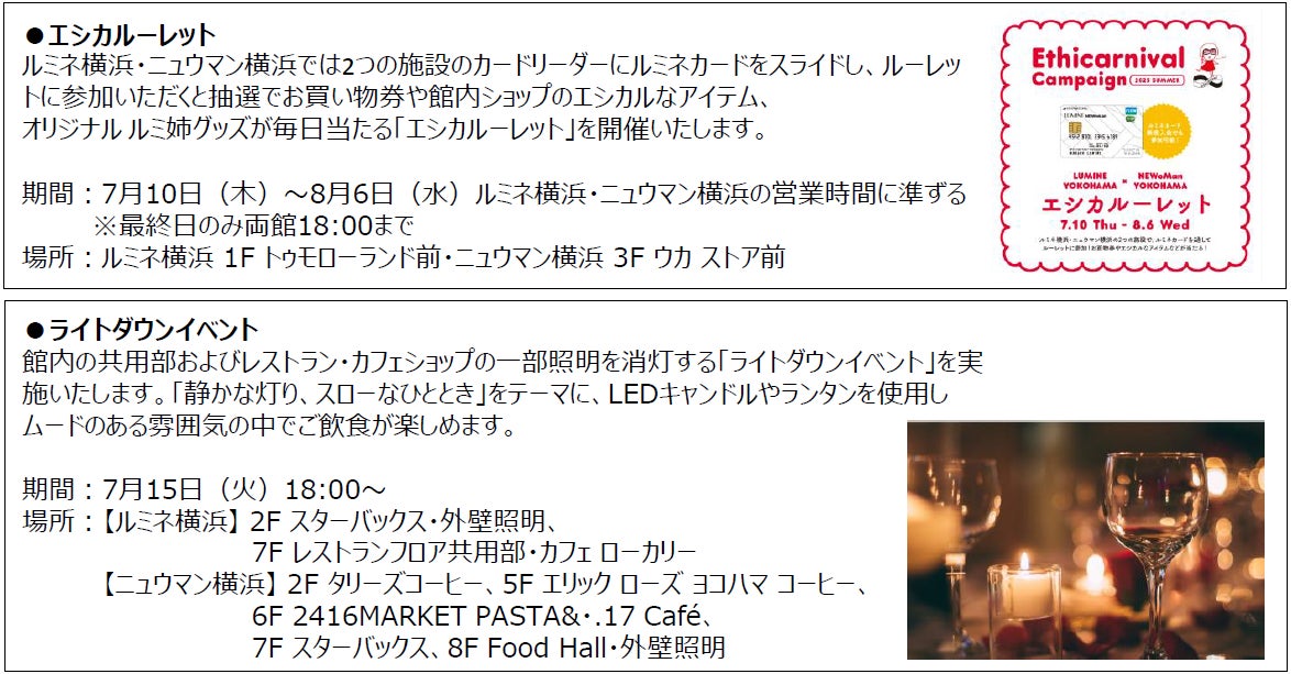 ルミネ横浜・ニュウマン横浜は合同でお買い物券や館内ショップのエシカルなアイテムが当たるルーレットキャンペーン「エシカルーレット」、館内の共用部およびレストラン・カフェショップの一部照明を消灯するライトダウンイベントを実施いたします。