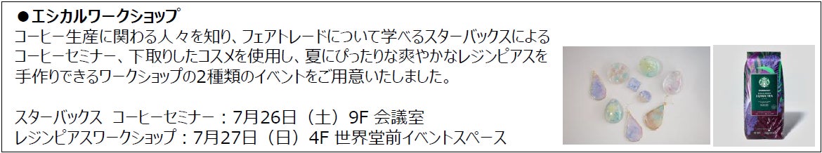 「コスメやファッションアイテムのサンプルセール・アーカイブ品の販売」、「エシカルワークショップ」など各ショップにある掘り出しものをお得に楽しくお買い物・体験できるイベントを開催いたします。