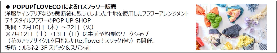 浴衣での来館による飲食特典など、夏を楽しみ尽くす企画を多数展開します。7月10日(木)~22日(火)にかけて、期間限定OPENの「LOVÉCO」ではロスフラワーの販売を実施。さらに7月24日(木)~8月6日(水)期間はSPECIAL 2WEEKSを開催!アウトレット品やアーカイブ品などの掘り出し物を見つけてみませんか?