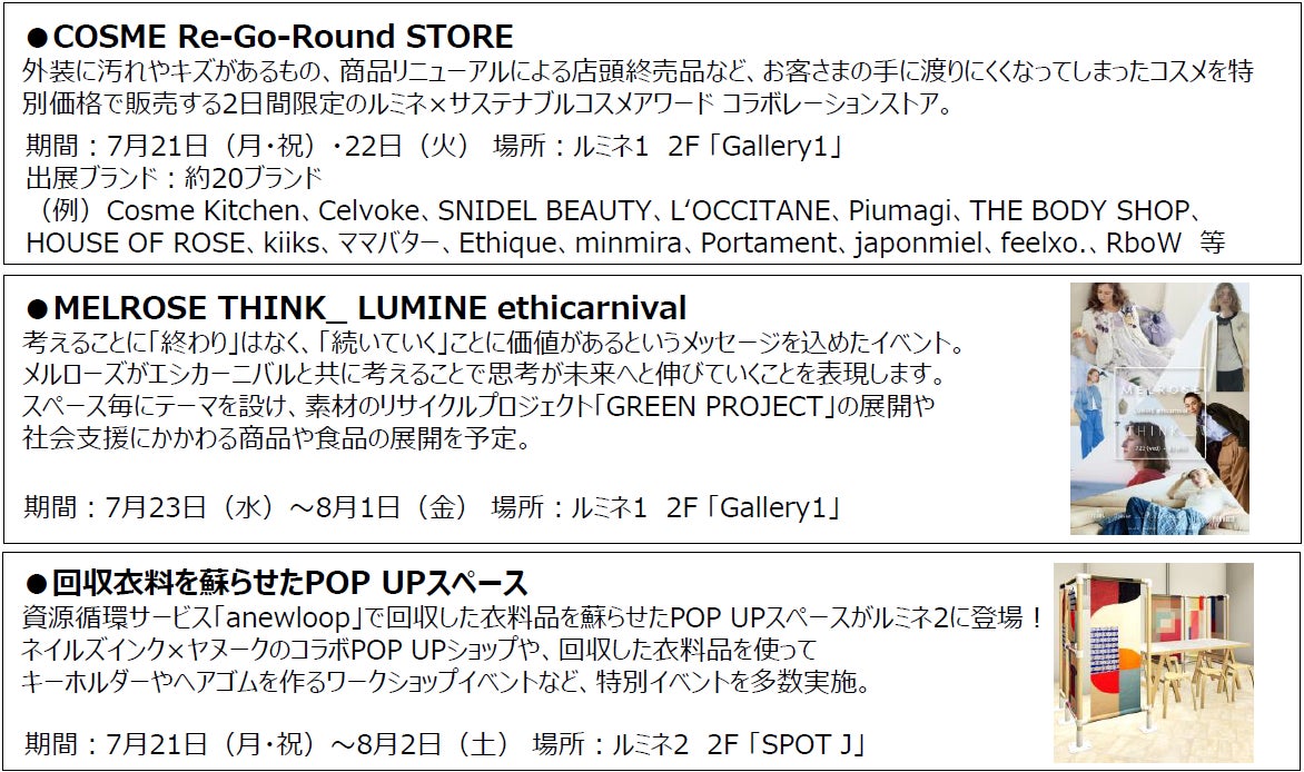 ルミネ新宿ではサステナブルコスメアワード受賞ブランドが集まるPOP UPショップやナチュラルコスメブランド「kiiks」のディレクターを務めるモデルで俳優の水原希子さんを招いたトークショー&フォトシューティングイベントを開催!今年1月にも開催し大好評だった、コスメの再循環を目指す「COSME Re-Go-Round STORE」や株式会社メルローズが手掛ける限定POP UP、回収した衣料品を使ったPOP UPスペースの出現など、エシカルなイベントを多数実施します。