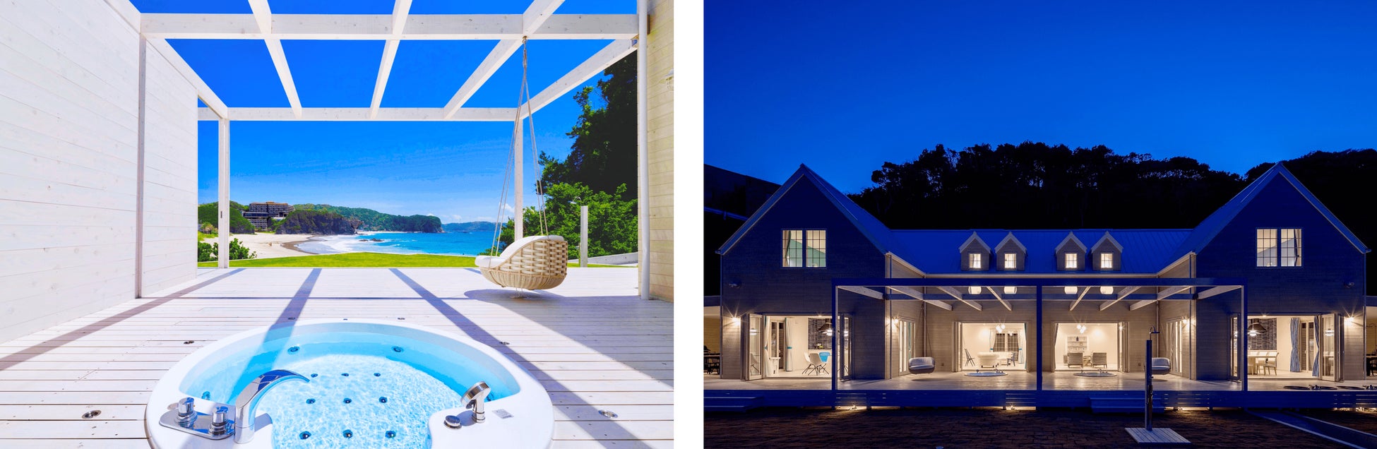 Aquaholic Iritahamaは、水を楽しむことがコンセプトとなっており、1階にあるオーシャンビューのテラスでジャグジー、五右衛門風呂、バーベキューが楽しめます。夏季はもちろん、年間を通じて温暖な入田浜の海の魅力を感じながらお過ごしいただけます。