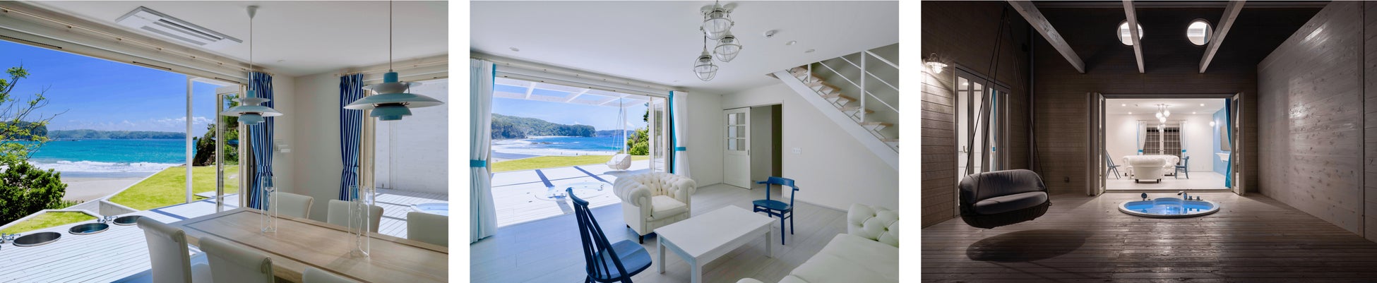 インテリアはイタリア・ポルトローナ・フラウ社製家具を多く用いており、A・Bの2棟はそれぞれティファニー・ブルー、ライト・マリンブルーを基調にコーディネートされています。それぞれ6名ずつ宿泊可能で、2棟貸切で最大12名でご利用いただけます。カップル・ご夫婦でのご利用から、ご家族や趣味の仲間とのバカンス時間を過ごすご旅行にもご利用いただきやすくなっております。