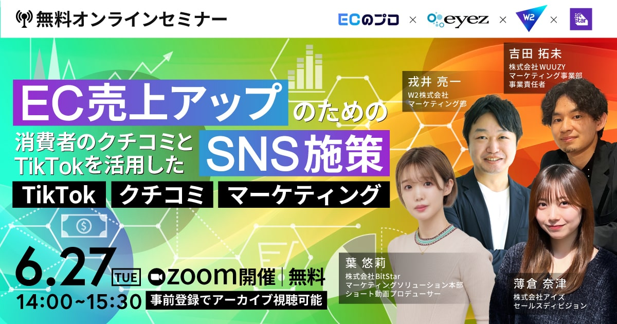 クチコミマーケティングのプラットフォームを運営する株式会社アイズ(所在地:東京都渋谷区、代表取締役社長:福島範幸、東証グロース:5242)は、6月27日(火)に開催される無料オンラインセミナー「EC売上アップのための消費者のクチコミとTikTokを活用したSNS施策」に登壇します。