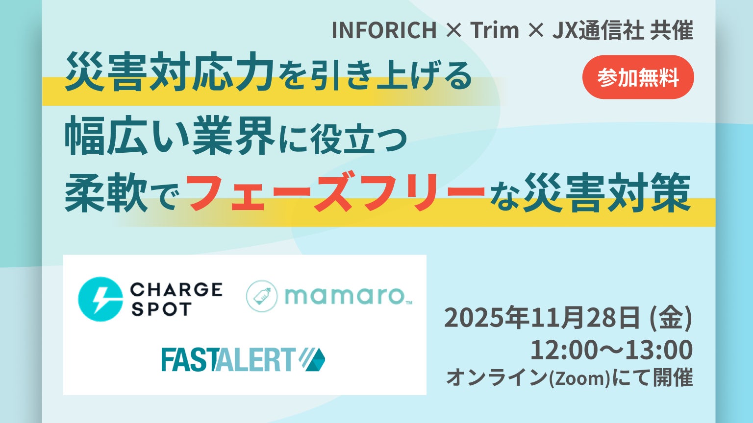 防災DXを推進する報道ベンチャーの株式会社JX通信社(東京都千代田区、代表取締役 米重 克洋、以下「JX通信社」)・株式会社INFORICH(東京都渋谷、代表取締役 Group CEO:秋山 広宣、以下「INFORICH」)・Trim株式会社(神奈川県横浜市、代表取締役社長 長谷川 裕介、以下「Trim」)は、11月28日(金)共催ウェビナーを開催することをお知らせします。