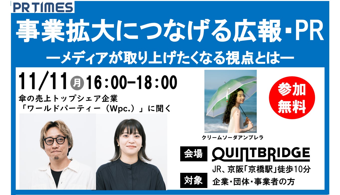 同セミナーは、11月11日(月)、NTT西日本が運営するオープンイノベーション施設「QUINTBRIDGE(クイントブリッジ)」で開催(主催:PR TIMES、後援:神戸新聞社、アンカー神戸)。男性日傘のイメージを変え、事業拡大に貢献する広報・PR活動の方法について、累計30万本を突破した大ヒット商品「クリームソーダアンブレラ」の企画、販促、広報を手掛けた株式会社ワールドパーティーの角谷圭一朗氏と中村友香氏が解説します。