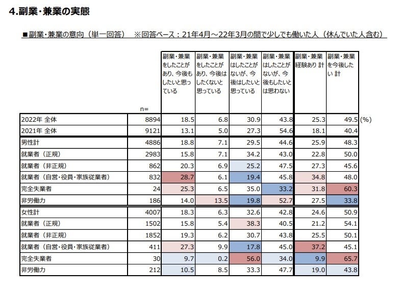 キャリア自律の重要性が叫ばれる昨今、企業の副業解禁の流れも加速し、副業やフリーランスなど働き方を変化させる人が増えています。2022年4月に実施された「ライフキャリア実態調査」によると、「副業・兼業経験あり」と答えた人は25.3%であり、2021年の同調査と比較し7.2%増加。また「副業・兼業を今後したい」と答えた人は、同じく昨年の結果から9.1%増加した49.5%と約半数にのぼり、副業・兼業への意欲・関心が高まっていることが分かります。(※1)