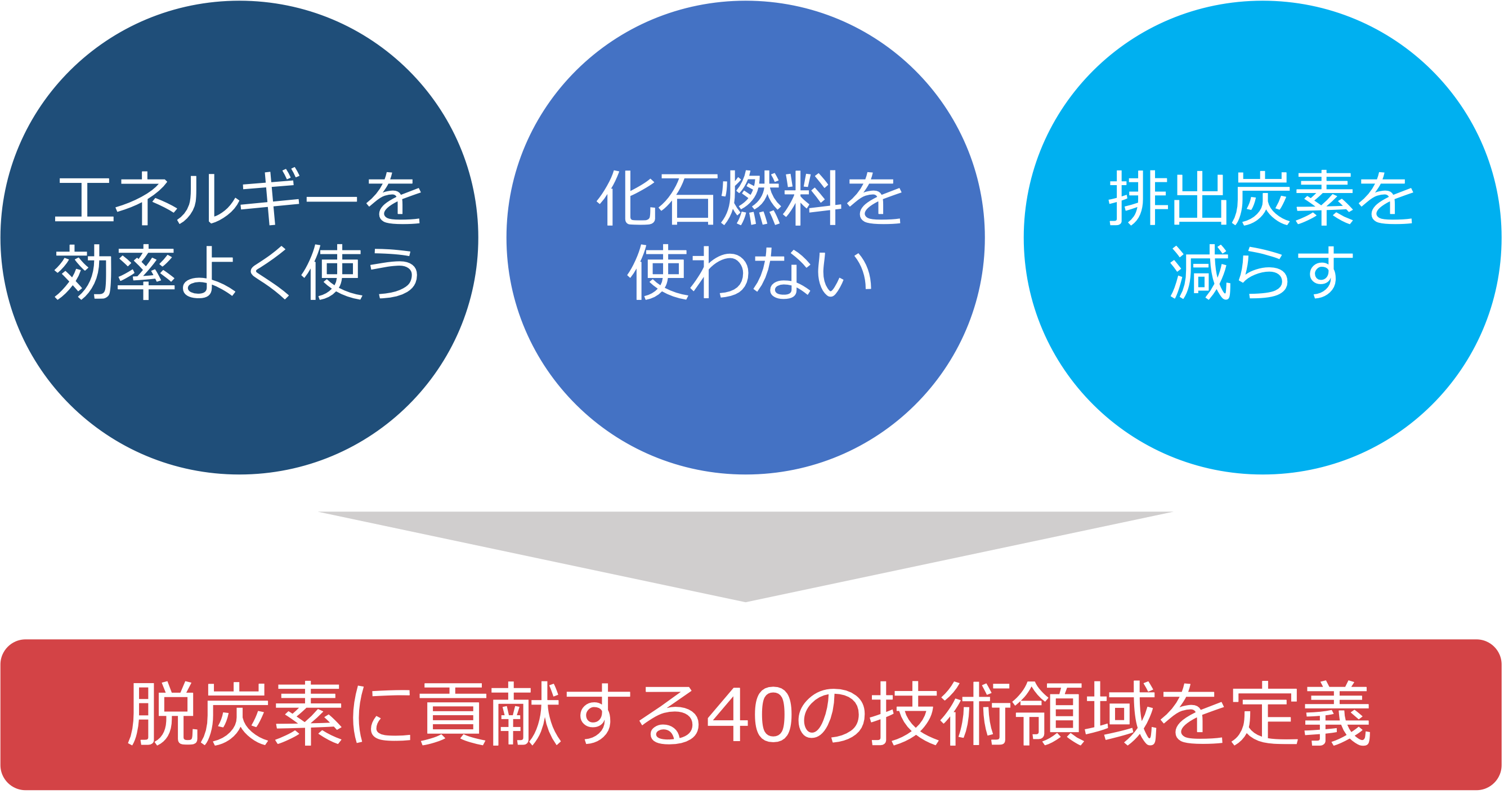 アスタミューゼでは、脱炭素に対する解決策を大きく3つの方法に分類し、それぞれに紐づく40の技術領域を定義しています。質問に対する回答をもとに、アスタミューゼが持つデータによって、各企業様が属する産業、領域ごとにどのような取り組みが適切かを診断できます。