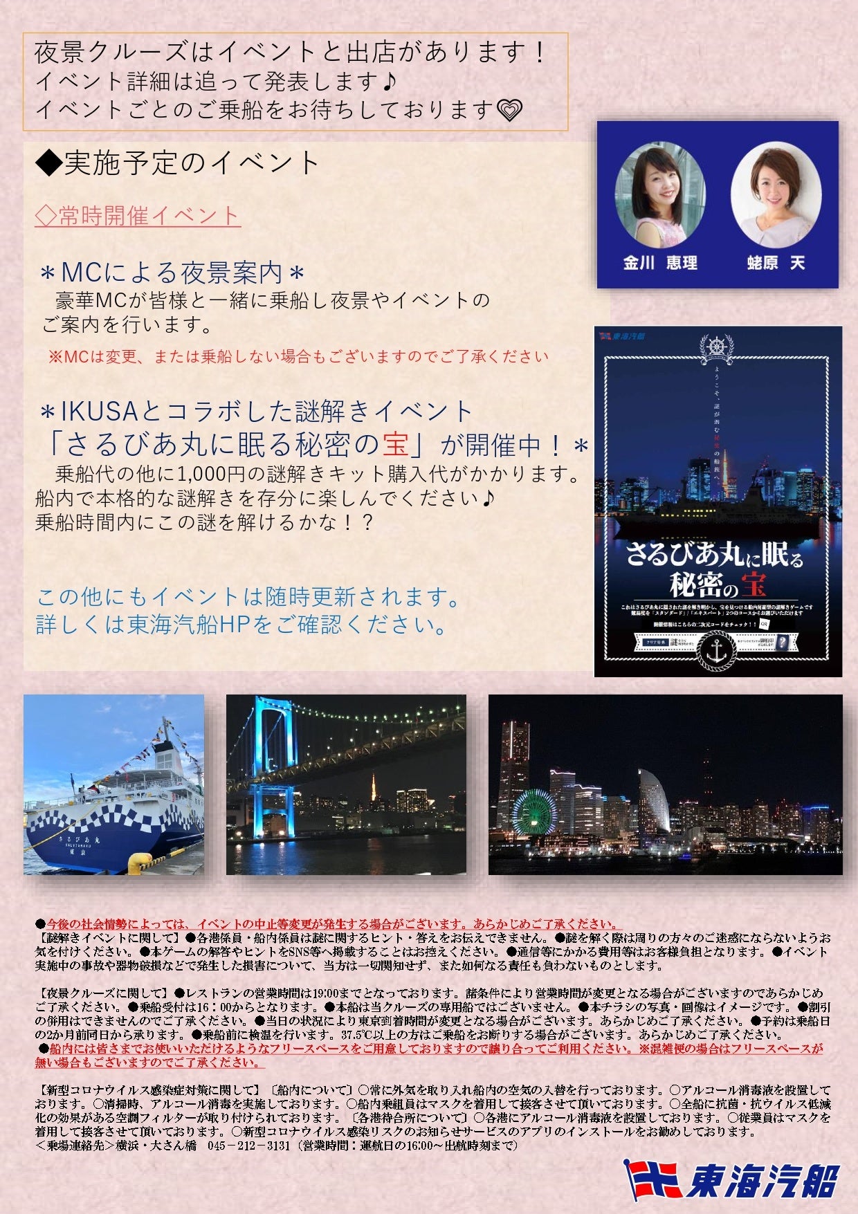 このクルーズは、東京竹芝桟橋と東京諸島を結ぶ定期船「さるびあ丸」が土・日曜日に横浜・大さん橋に寄港することから、ロマンチックな東京湾の夜景を眺めながら、お手軽に横浜→東京のクルーズをお楽しみいただくものです。