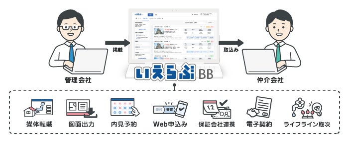 管理会社も仲介会社も無料(一部オプション機能あり)で利用でき、物件流通から内見予約・申込み、保証審査や契約までを一気通貫でサポートします。