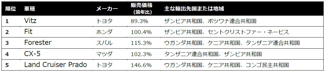 2024年のTCV年間売上ランキングは以下の通りとなりました。TCVで最も売れた車種は、前年に引き続きTOYOTAのコンパクトカーのヴィッツ。1位から5位まで総じてアフリカ諸国への輸出が多く、販売価格に関しては10%程度安くなったヴィッツや1.5倍にまで上昇したランドクルーザーを除いては、前年比でほとんど変わらない車種が多くみられました。日銀が政策金利を上げることで今後段階的に円安が収まっていくことが予想されるので、輸出事業の先行きに注目する必要があるようです。