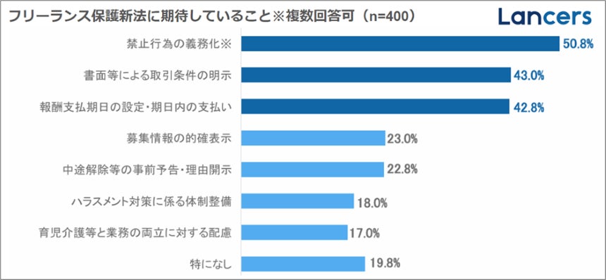 フリーランス保護新法で義務となる項目から選択してもらった結果、最も期待されていることは「禁止行為の義務化」(※3)で50.8%を占めた。次いで、「書面等による取引条件の明示」「報酬支払期日の設定・期日内の支払」が上位となり、取引条件や報酬に関する改善が求められていることが窺える。