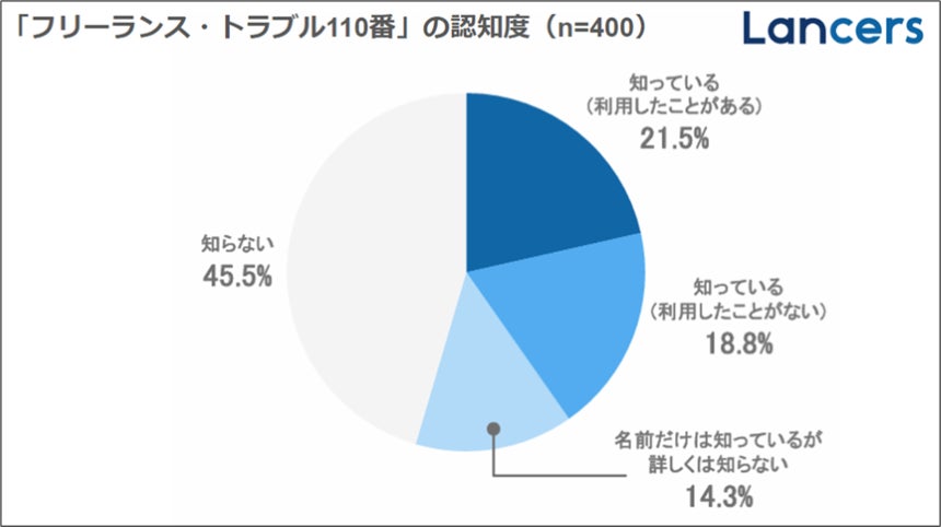 フリーランスマッチングプラットフォーム「Lancers」を運営するランサーズ株式会社(本社:東京都渋谷区、代表取締役社長 CEO:秋好 陽介、東証グロース:4484、以下『ランサーズ』)は、フリーランス(個人事業主・副業含む)(※1)として働く400名を対象に「フリーランス保護新法(フリーランス・事業者間取引適正化等法)に関する実態調査」を実施しました。