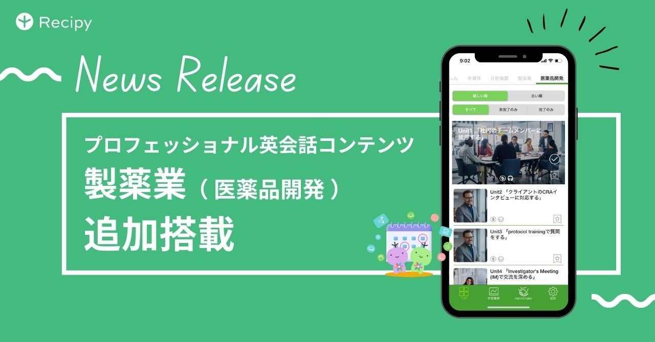 ビジネス英語にも強い英語学習アプリ『レシピー』が、プロフェッショナル英会話コンテンツに「製薬業(医薬品開発)」を追加搭載 - 株式会社ポリグロッツ( POLYGLOTS )