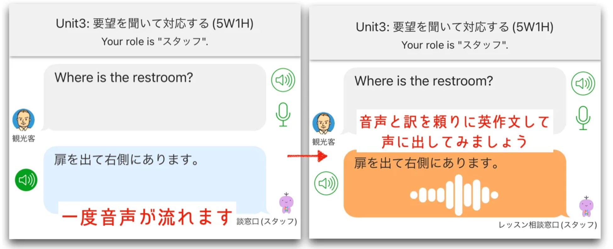 UNITを選択したら「スタート」を押して学習を始めます。2人の会話フレーズが始まるので、あなたのロールになりきって英語で対応しましょう。あなたのパートは日本語訳が画面に表示され、最初に音声が一回流れるので、それを頼りに英文を考えて声に出しましょう。