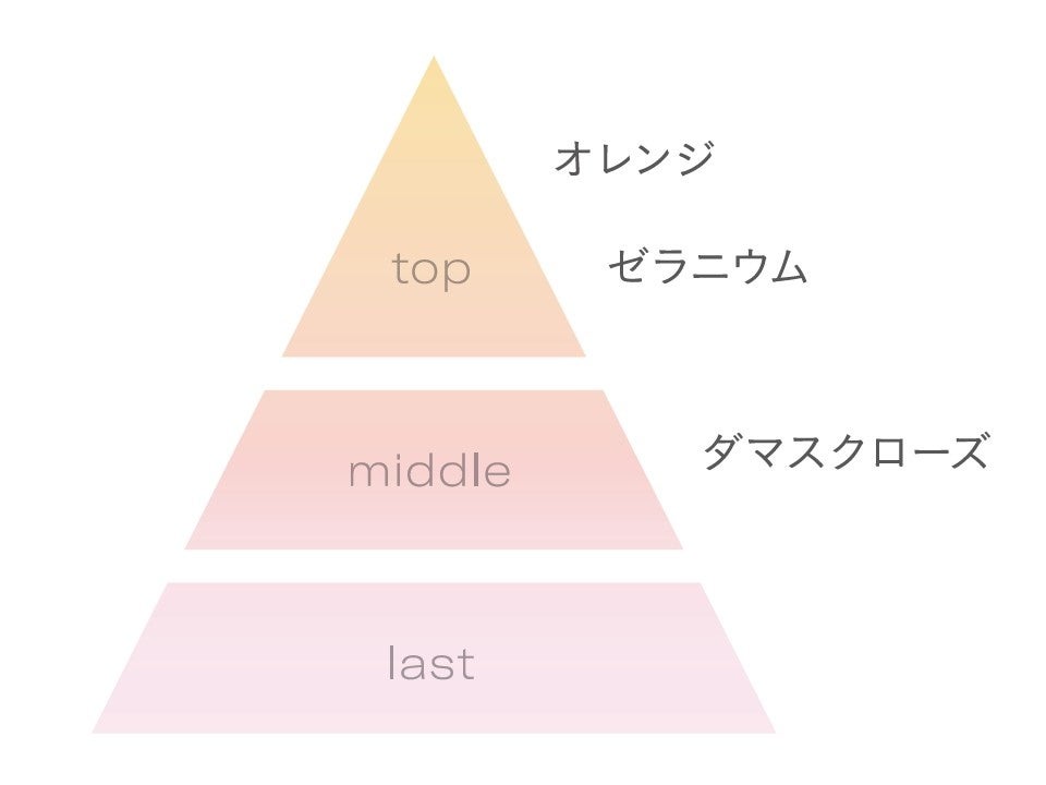 香り高いダマスクローズにオレンジとゼラニウムをブレンドし、フレッシュで軽やかなニュアンスのあるフローラルに。またダマスクローズのフローラルウォーターも含んでいるため、まるで摘みたてのバラのようなみずみずしさも感じられます。