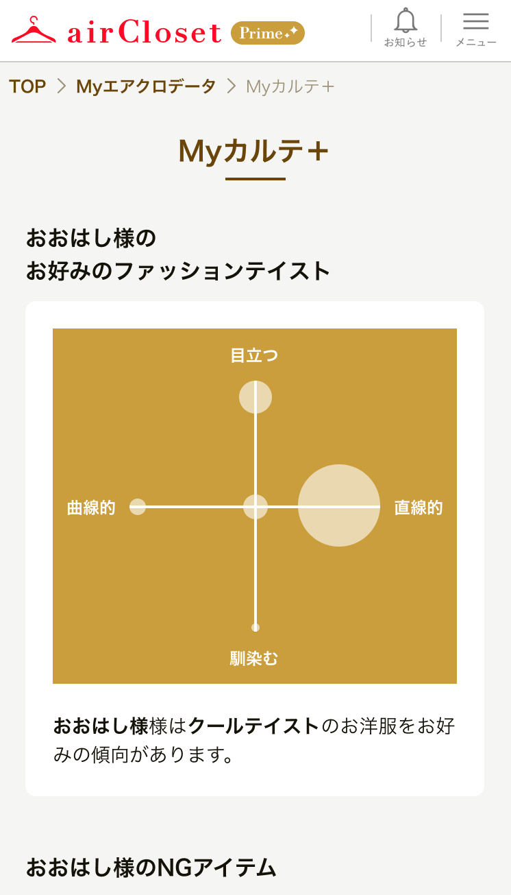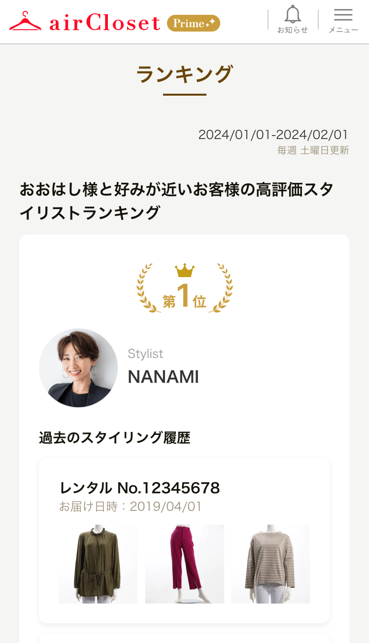 このたび提供を開始する「エアクロプライム」は、まずレンタル中のお洋服を汚してしまった際の修繕費用が完全無料になることで、安心してサービスを楽しめることが特徴のひとつです。加えて、新たに提供するパーソナライズコンテンツでは「新しい発見」をコンセプトに、お客様のご利用情報に基づいた次の3つの機能を提供します。お客様が好みとするテイストやカラーを可視化する「Myカルテ+(プラス)」、これまでのサービスの利用履歴を視覚的に提示する「ご利用レポート」、ご自身と好みの近いお客様が評価したお洋服やスタイリストをランキング形式で表示する「ランキング」です。これらのコンテンツによって、お客様は自身がなんとなく選択している好みを明確にすることができ、それにより、いつもと異なるテイストのお洋服へのチャレンジ等がしやすくなります。加えて、次回のお洋服のリクエストを具体的に伝えられるようになるため、スタイリングの精度が高まります。また、「自身と好みが近い人」という新しい観点で、お洋服やスタイリストと出会うことができるようになります。