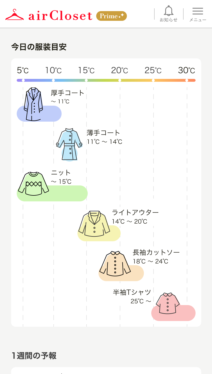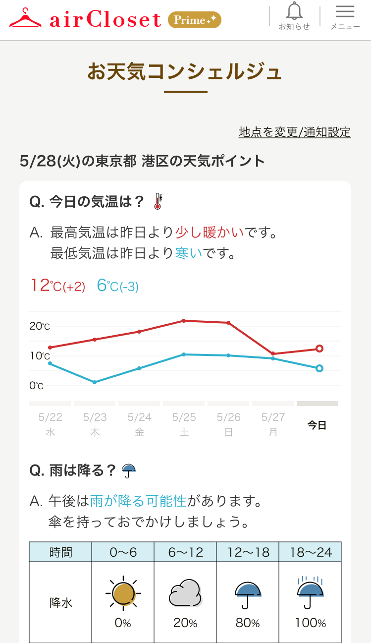さらに、日々のお洋服選びに役立つ情報(天候、降水確率、気温や寒暖差など)が届く「お天気コンシェルジュ」のコンテンツを提供します。この機能は、お客様のお住まいの地域の天候情報に加え、昨日と比べて暖かくなるか・寒くなるかといった気温変化等をお届けすることで、お客様の日々のお洋服選びをリアルタイムでサポートします。