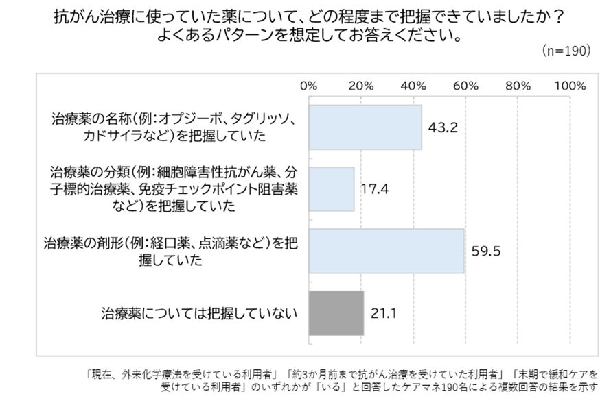 「現在、外来化学療法を受けている利用者」「約3か月前まで抗がん治療を受けていた利用者」「末期で緩和ケアを受けている利用者」のいずれかが「いる」と回答したケアマネを対象に、がん化学療法に用いた抗がん剤の把握状況を複数回答で聞きました。