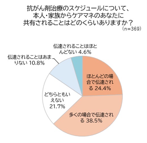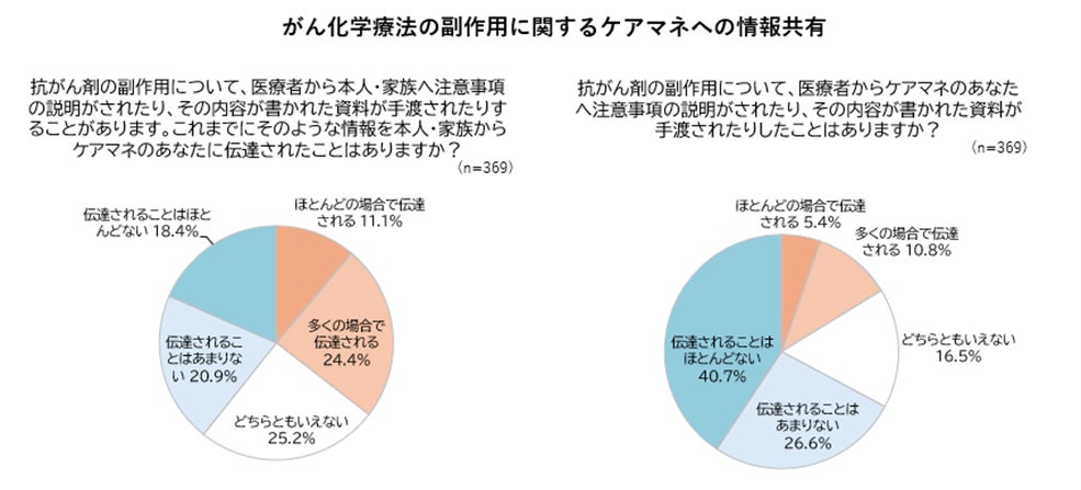 特に細胞障害性抗がん剤は副作用の出るタイミングが時期によって予想できるため、それに合わせてケアプランを変更することが望ましいと思われますが、一部のケアマネにはその情報が伝えられておらず、適切なケアプラン作成・運用に支障が生じているのではないかと推察されます。