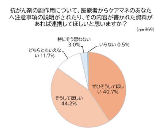 今回の調査では、ケアマネの約8割は医療者から抗がん剤の副作用について注意すべきことを説明してほしい、資料を連携してほしいと望んでいました。