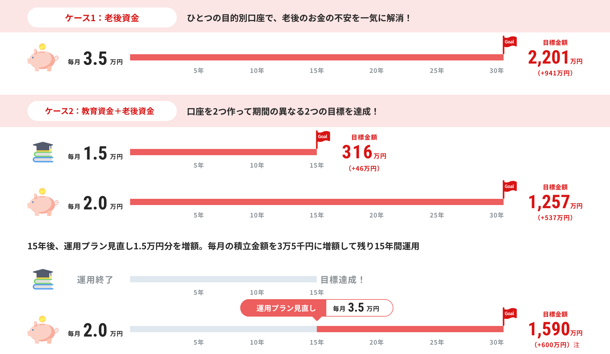 それぞれマイホームの資金や教育資金、セカンドライフ資金など、ご自身のライフスタイルにあった資金別に目的別口座を作ることができます。各口座ごとに目標金額、つみたて金額、つみたて期間、運用する運用戦略などを設定することが可能です。