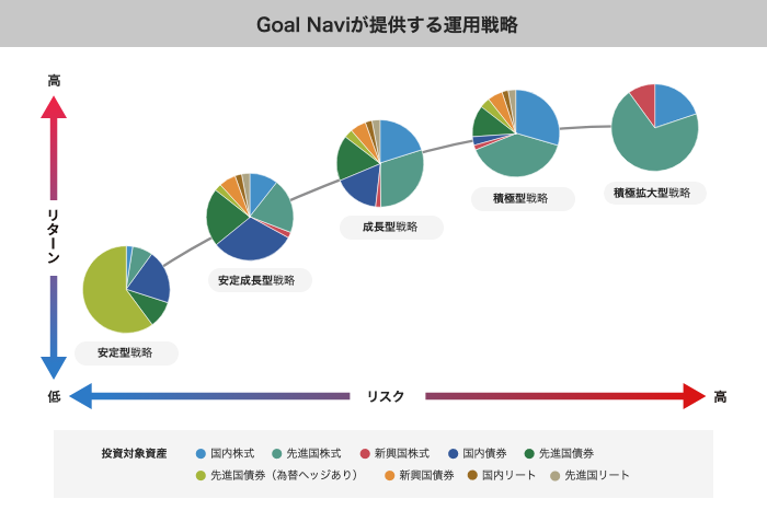 運用戦略については株式や債券、リートなどそれぞれを組み込み、リスク・リターンが異なる5つの戦略を準備しています。