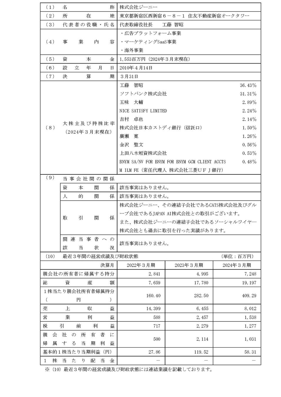 そのような中で、当社グループと事業シナジーのある第三者と提携を行うことで収益及び財務面での改善を行うことが、当社グループの事業成長や企業価値向上に資すると考え、様々な可能性を検討しておりました。候補先の一つであったジーニーは「誰もがマーケティングで成功できる世界を創る」「日本発の世界的なテクノロジー企業となり、日本とアジアに貢献する」という2つのパーパスを掲げ、広告プラットフォーム事業、マーケティングSaaS事業及び海外事業の3事業を展開しております。広告プラットフォーム事業ではGENIEE DSPやGENIEE SSPといったプラットフォームを提供しており、費用対効果を最大化させるプラットフォームとして国内シェアトップクラス、マーケティングSaaS事業では集客から販促、受注までを通貫して実行できる唯一の国産セールス&マーケティングプラットフォームを提供しており、それらを海外事業において成長著しいアジア圏を中心に積極的に展開しております。