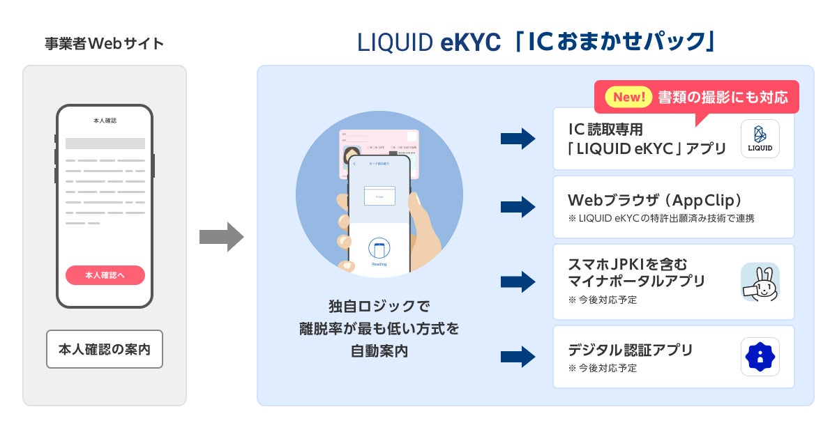 マイナンバーカードや運転免許証などのICチップを活用した本人確認方式を一式提供し、各ユーザーに対して離脱率が最も低い読取チャネルを自動で案内するサービスです。例えば公的個人認証(JPKI)による本人確認時に、ユーザーのスマホOSを自動で判別し、iOSユーザーはWebブラウザ、Androidユーザーは「LIQUID eKYC」アプリといったユーザーごとに最適な本人確認が実施できるようになります。
