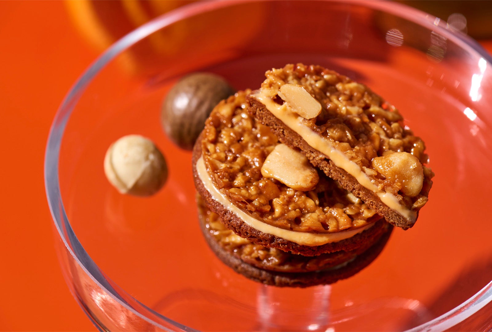“ナッツの王様”マカダミアナッツの形が異なる2種を使った甘く香ばしいザクザク食感のチュイールに、オレンジがほんのり香るチョコレートコーチングとザクほろオレンジクッキーを重ね合わせました。香ばしさとほんのりとした酸味、やさしい甘さが口の中で一体となる奥深い味わいと、ザクザク食感が特徴的な3層で出来た新感覚フロランタンです。