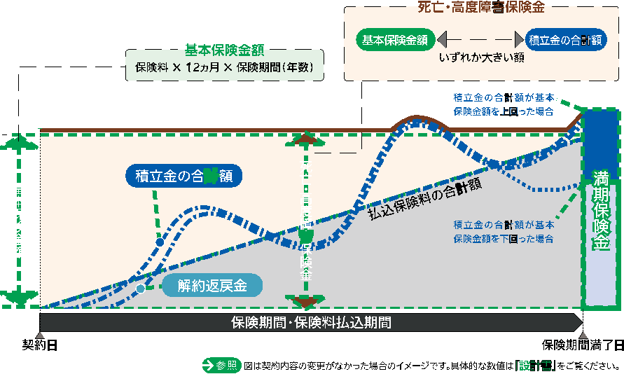 ・保険期間中に被保険者がお亡くなりになった場合、または所定の高度障害状態に該当した場合は、その時点の基本保険金額または積立金の合計額のいずれか大きい額が死亡保険金または高度障害保険金として支払われます。
