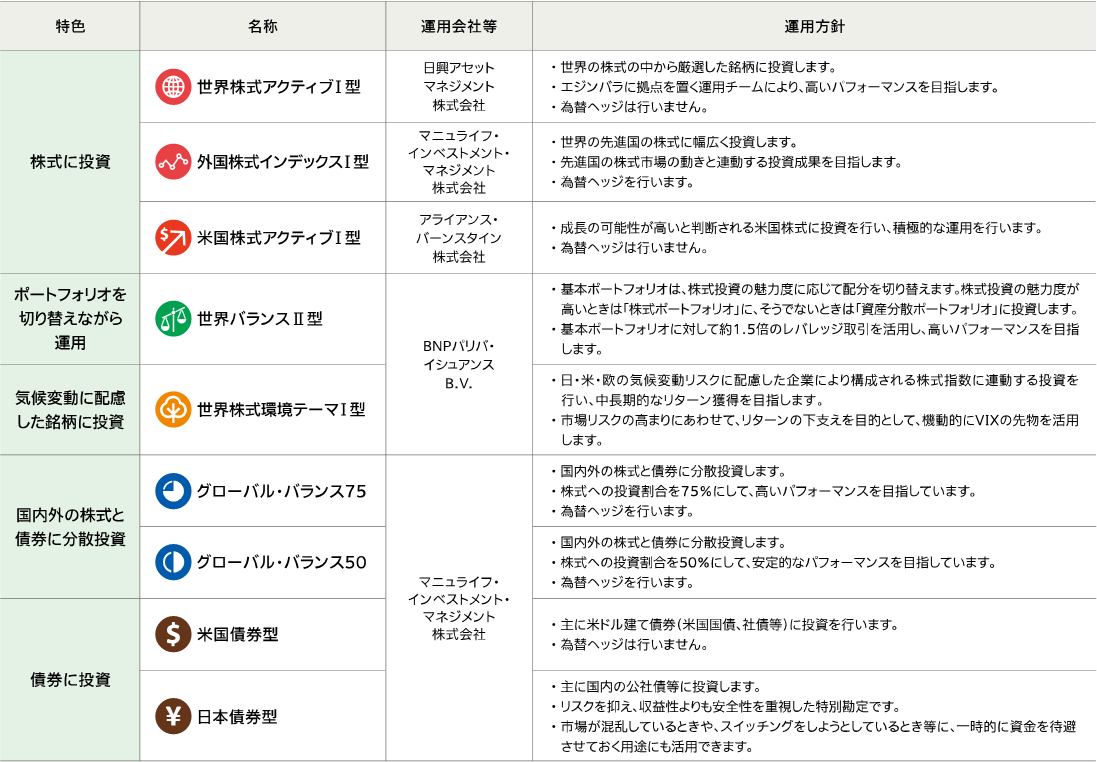 •お客さまの運用スタイルに合わせて、9種類の特別勘定から選択可能に