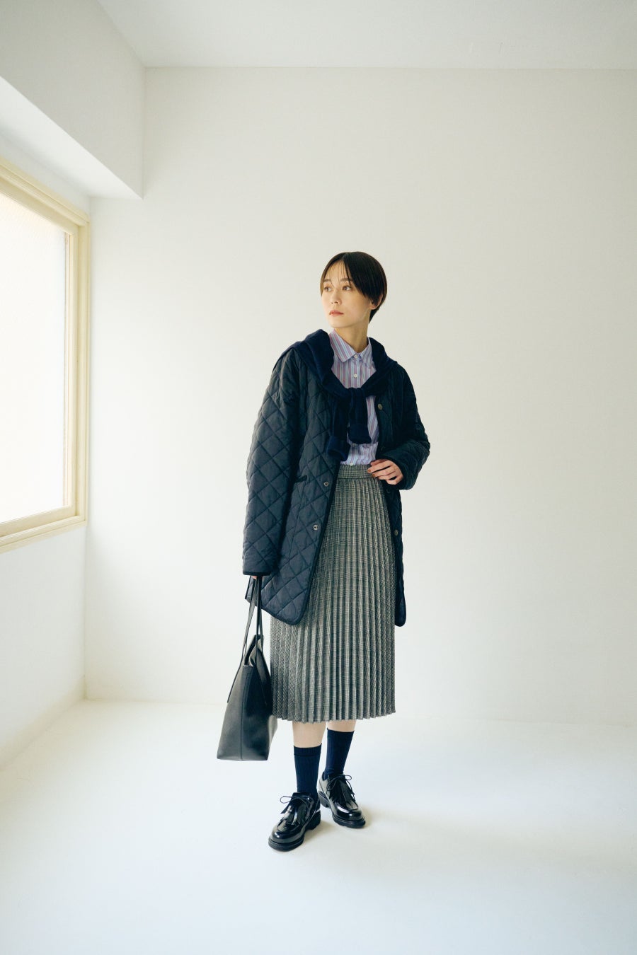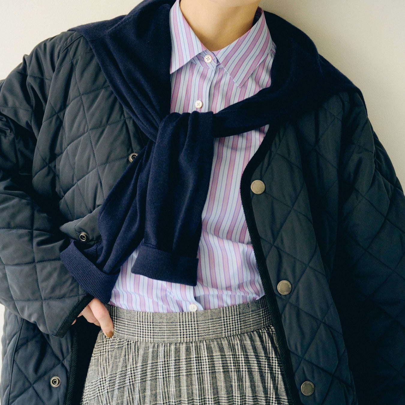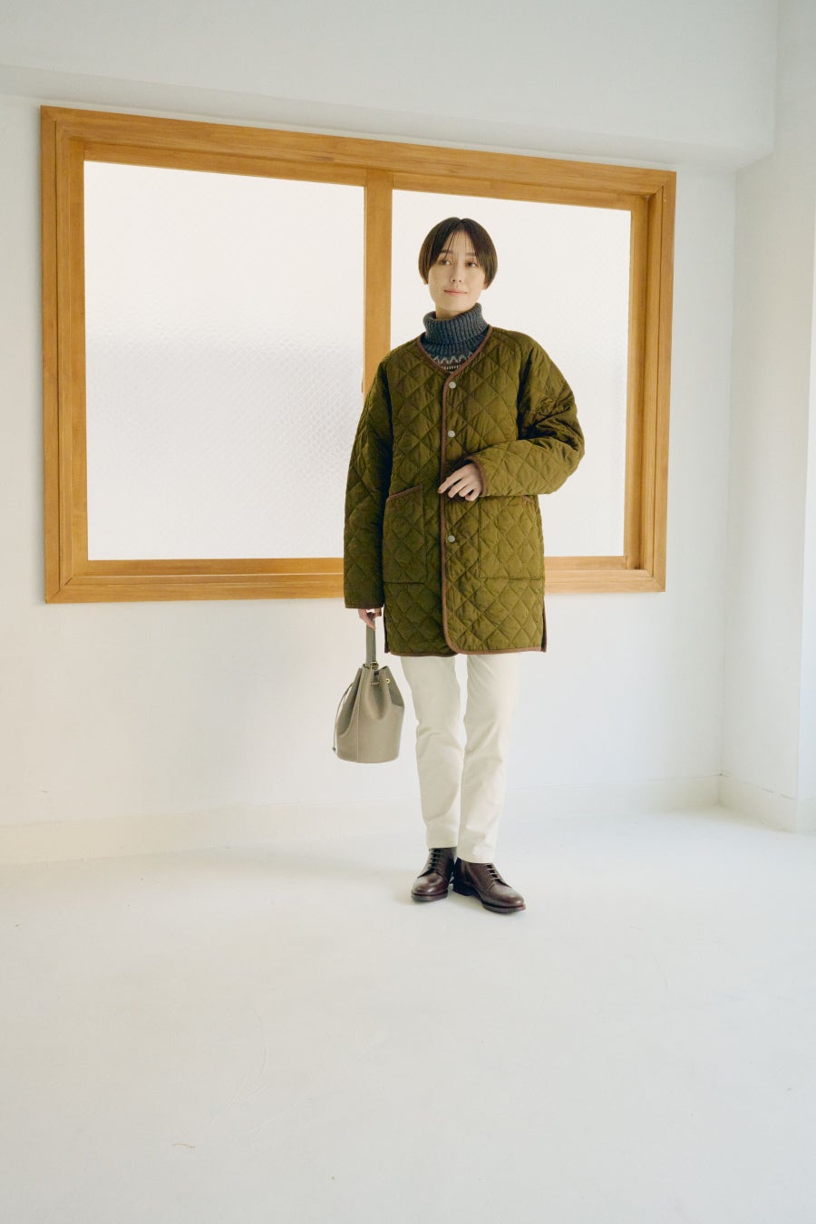 スーツの上にも羽織れる着丈の長さと、大きめのトップスに合わせてもかさばらないラグランスリーブは、どんなトップスでも美しく合わせられる設計になっています。各所に施されたパイピングやシャープすぎないVネックなど、オーセンティックな仕上がりも魅力です。
