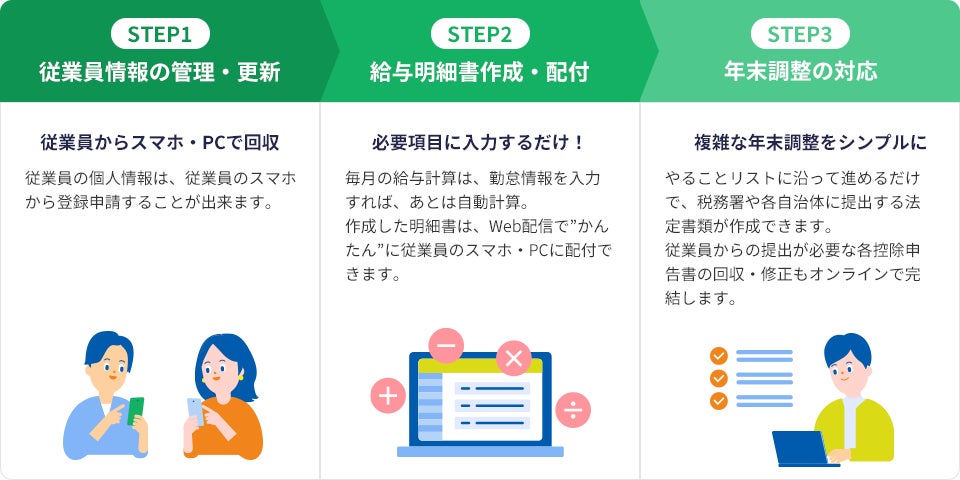 <「弥生給与 Next」は毎月の給与計算から年末調整業務まで、3STEP>