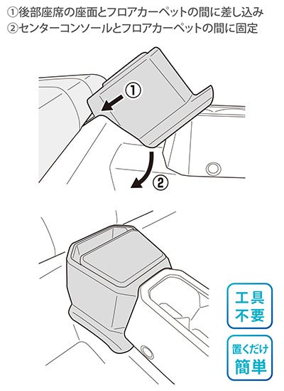 本製品は後部座席の座面とフロアカーペット・センターコンソールとフロアカーペットの間にそれぞれ固定部を挟み込むことで設置します。ドライバーを使用したり、両面テープで固定する必要はないため、簡単に取り付けることができます。後部座席に人が乗車する際、取り外しも簡単です。