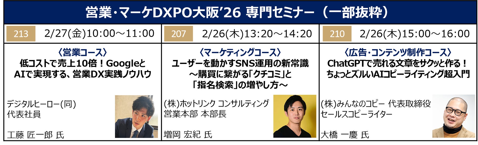 本展では、業界の有識者を講師に迎えた「専門セミナー」も同時開催する。営業コースでは、デジタルヒーロー(同) 代表社員 工藤匠一郎氏が、非効率な作業方法を見直し、Googleと生成AIを活用することで営業売上を10倍にした具体的な業務効率化の手法を公開、またマーケティングコースでは、(株)ホットリンク コンサルティング営業本部 本部長 増岡宏紀氏が、クチコミや指名検索を増やし売上につなげるSNS運用法を解説するなど、営業・マーケティング部門をはじめ、売上アップ・生産性向上を目指す経営者必聴のセミナーが多数開催される。
