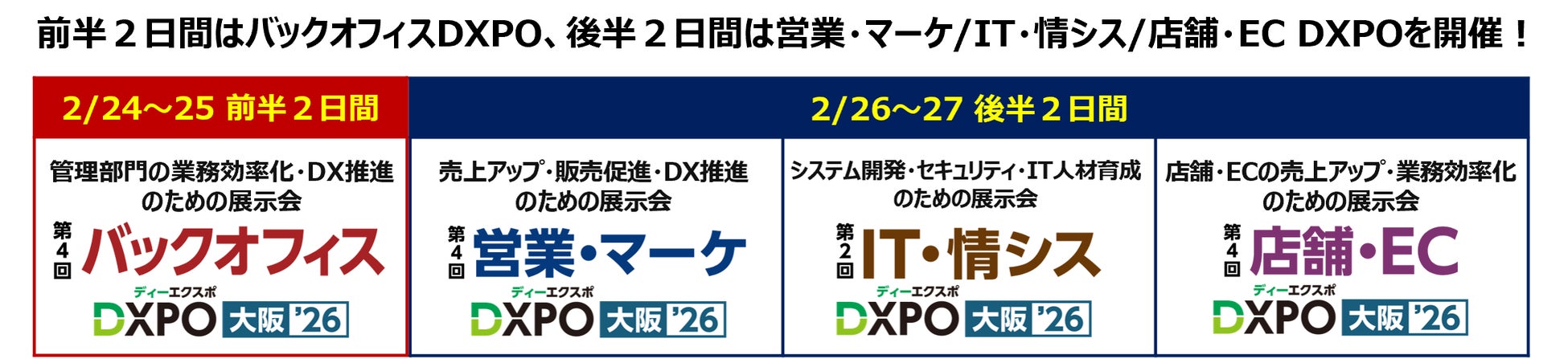 展示会事業、M&A仲介事業、人材採用支援事業を展開する、ブティックス株式会社(東京都港区、代表取締役社長 新村祐三、東証グロース上場 証券コード:9272)は、2月26日(木)・27日(金)の2日間「第4回 営業・マーケDXPO大阪’26」をインテックス大阪にて盛大に開催する。来場対象者は、DX推進に課題を持つ経営層に加え、営業、マーケティング、Web担当、集客・販促・PR担当の方々である。