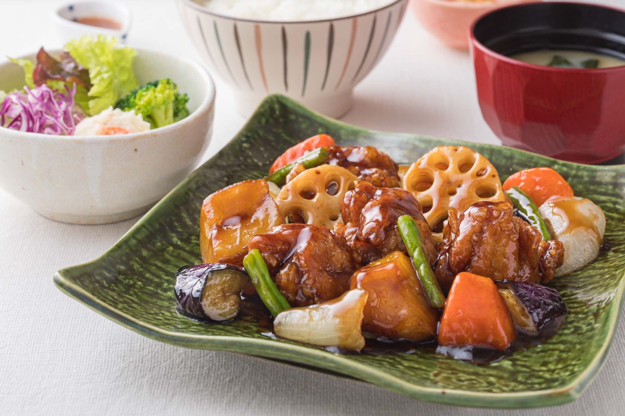 不動の⼈気No.1メニュー!⽞⽶黒酢と黒糖に、りんご酢で味を調えた、⼤⼾屋オリジナルの黒酢あん。