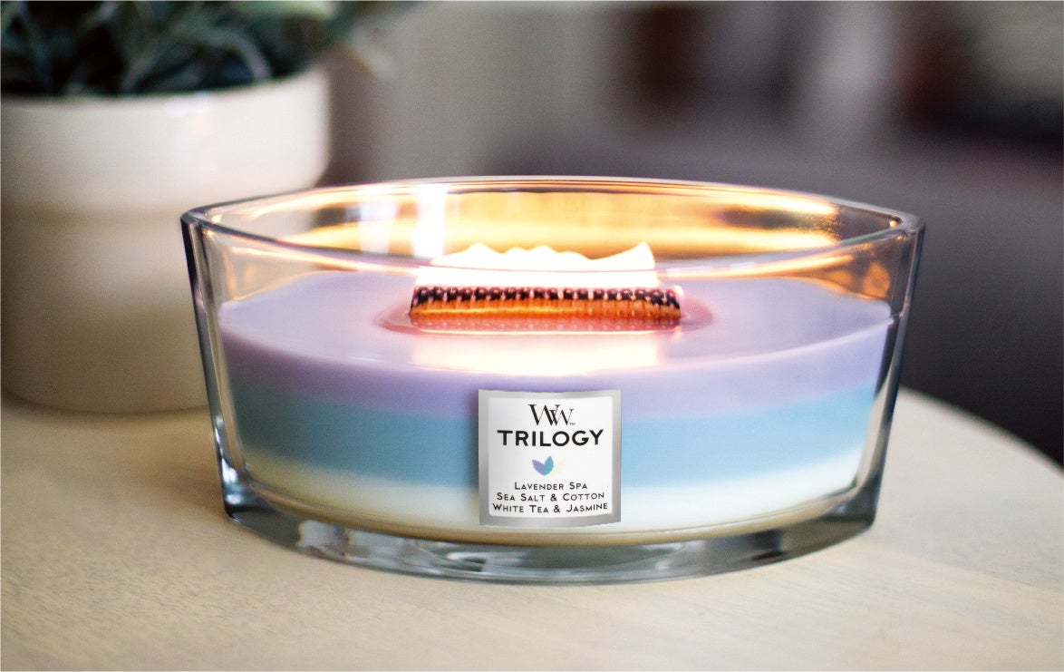 中でも、トリロジータイプは3つの香りが層になっていて、層ごとに香りの異なるプレミアムフレグランスを配合し、ウッドウィックのパチパチ音だけでなく、溶けていく色と香りのグラデーションも楽しめるアロマキャンドルです。