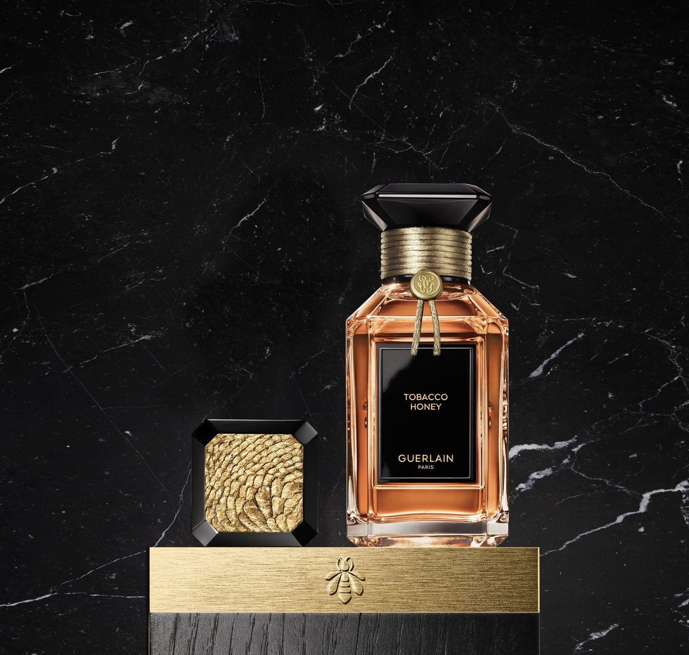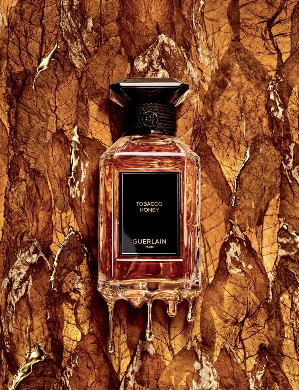 新たにコレクションに加わる〈タバコ ハニー〉は、ミステリアスでまだ知られざる魅力にあふれた原材料、“タバコ”にオマージュを捧げた香り。危険なまでにセンシュアルなタバコの香りは、ゲランにとって黄金ともいえるハニーと触れることでその最も美しい面を露わにします。黄金に輝くハニーのまろやかさと、タバコ アコードの病みつきになるような刺激が出会い、相反する2つの要素がパワフルな化学反応を起こします。そこにレザー、スモーク、チョコレート、ウッド、ハニー……ゲランの調香師が操る多彩なファセットが相まって『黄金のタバコの旋律』を奏でます。