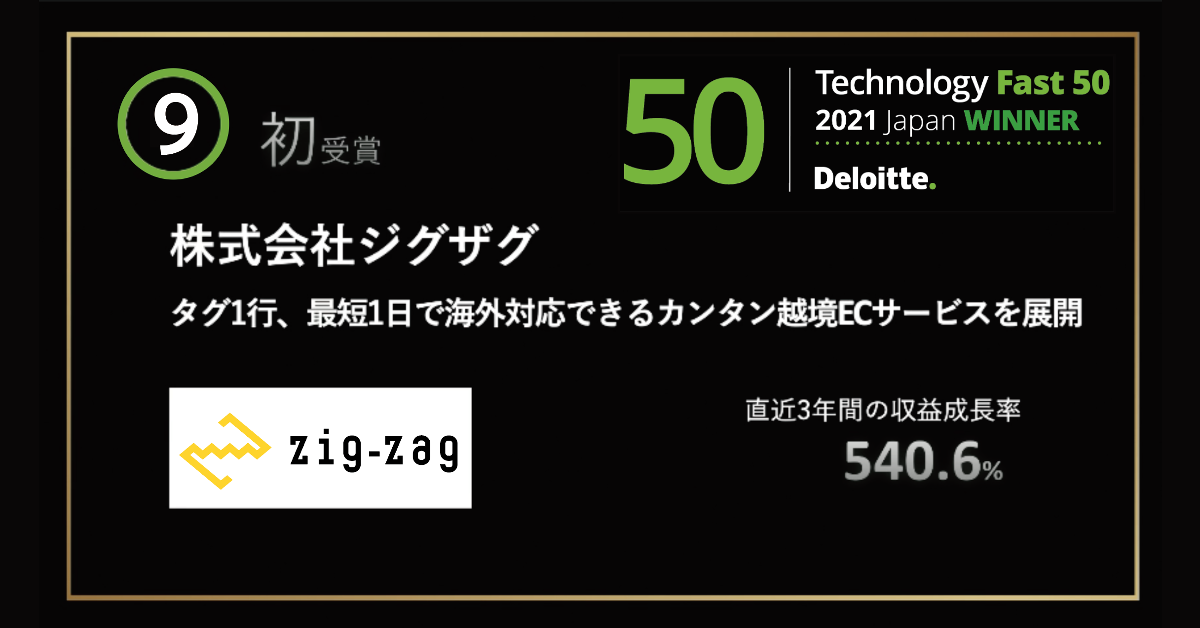 越境EC・ウェブインバウンド支援の株式会社ジグザグ(本社:東京都渋谷区、代表取締役:仲里一義)は、デロイト トーマツ グループが発表したテクノロジー・メディア・通信(以下、TMT)業界の収益(売上高)に基づく成長率のランキング、「2021年 日本テクノロジー Fast 50」において、過去3決算期の収益(売上高)に基づく成長率540.6%を記録し、8位を受賞いたしました。