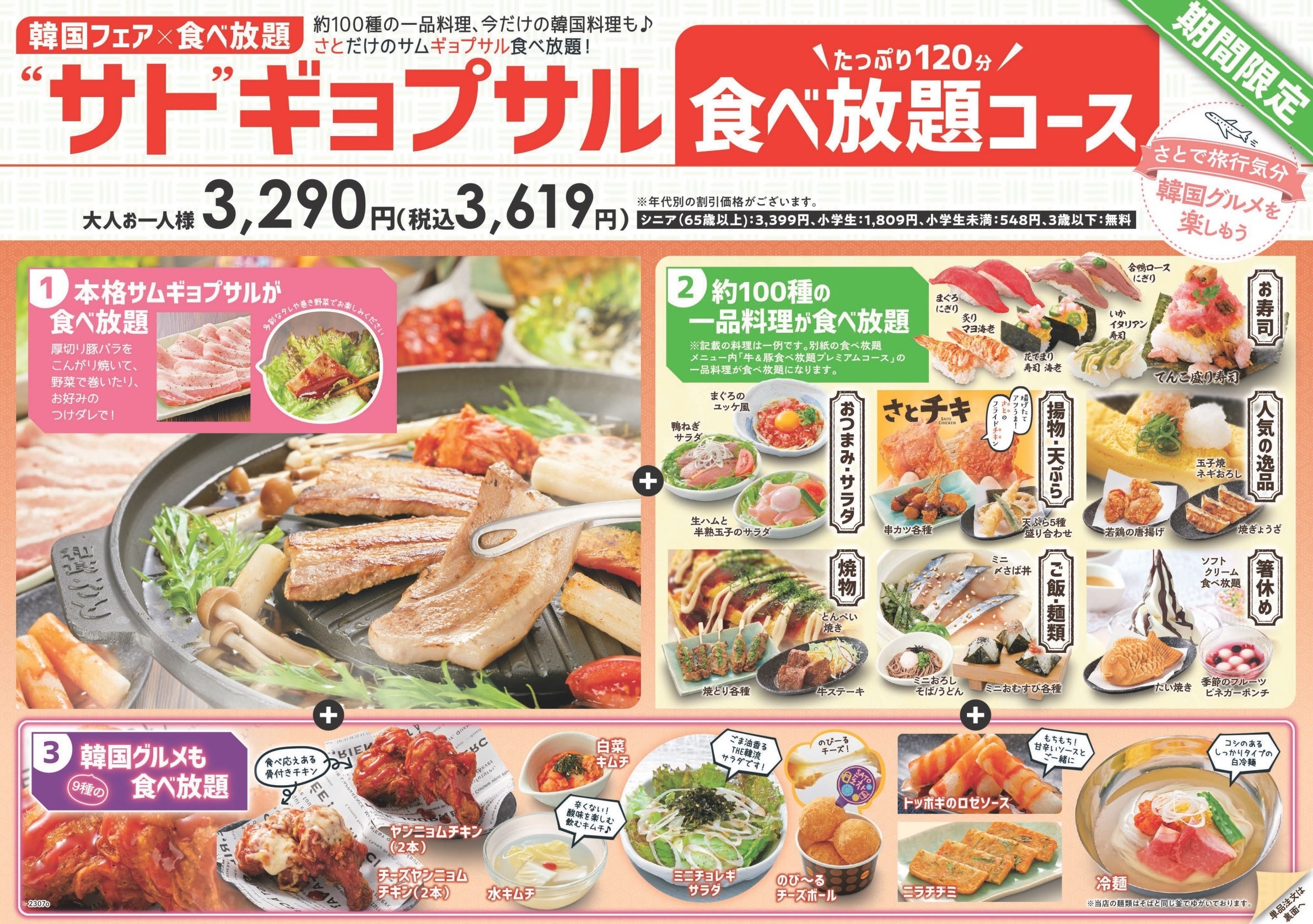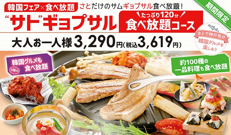 「ヤンニョムチキン」「ニラチヂミ」「チーズボール」など韓国グルメが食べ放題!! サムギョプサル食べ放題コース」も新登場!! その名も…『サトギョプサル』!!