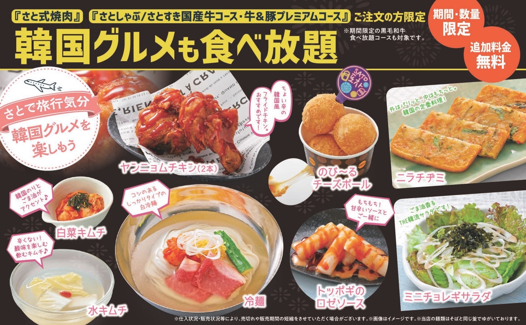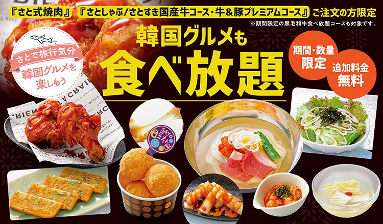※韓国グルメ食べ放題は、すき焼き食べ放題「さとすき」や国産牛コース、期間限定の黒毛和牛コースも対象です。