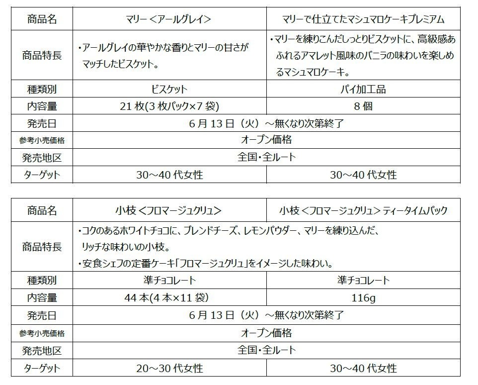 いずれの商品も、安食シェフの定番ケーキの味づくりにおけるノウハウを生かして開発され、素材の風味や味わいをお楽しみいただける商品に仕上げています。「マリー」100周年を記念した期間限定の特別な商品の発売により、お客様に笑顔をお届けしてまいります。