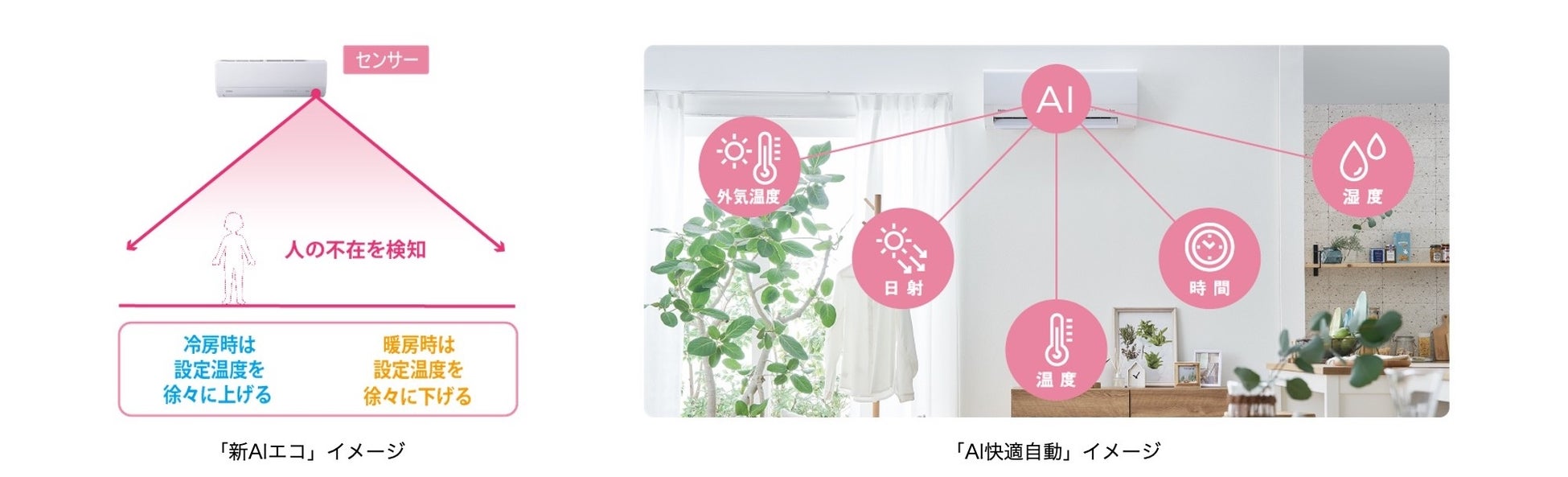 ①人の不在を検知し設定温度をコントロールして省エネ運転する「新AIエコ」※1